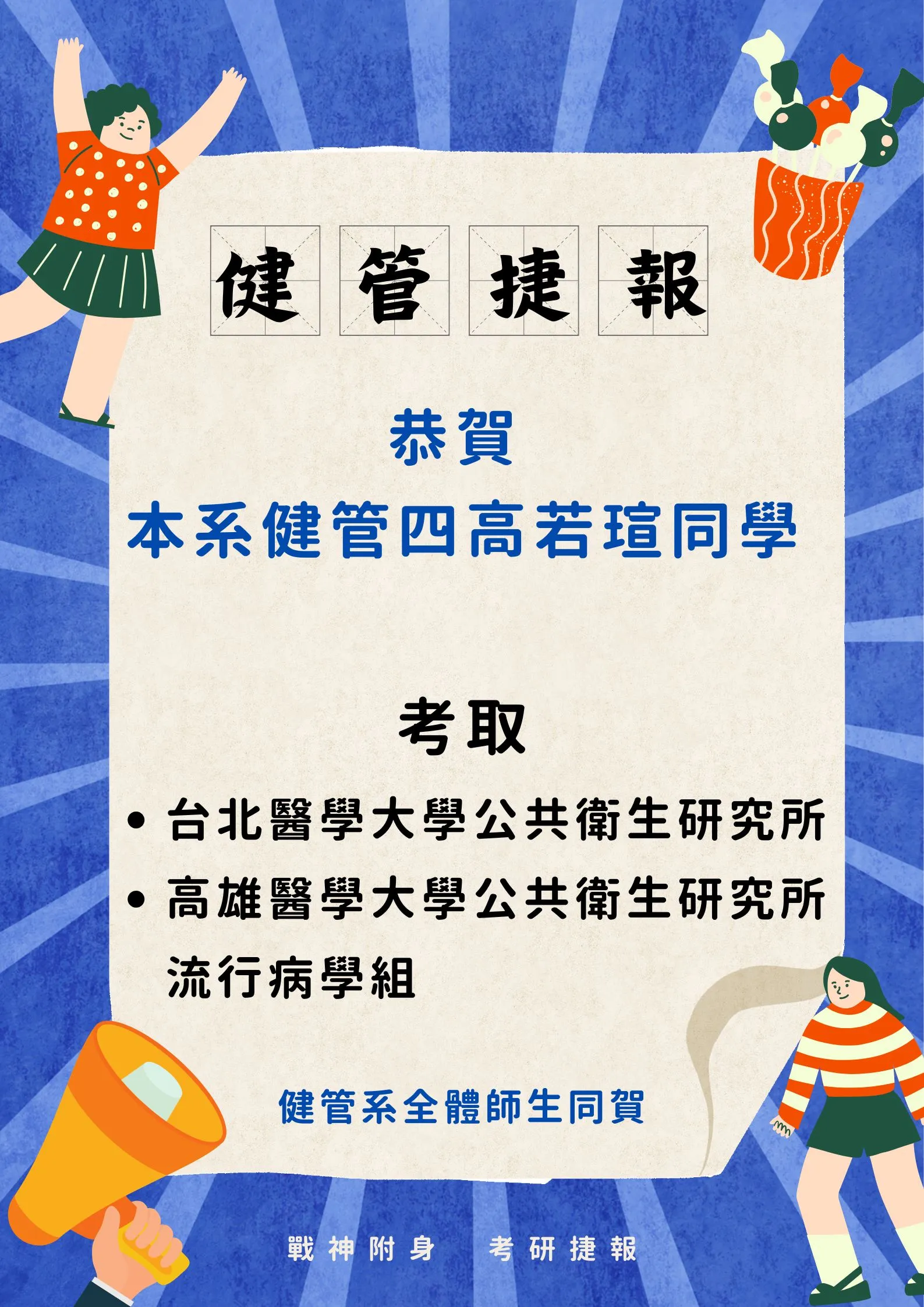 恭賀~~本系健管四高若瑄同學考取「台北醫學大學公共衛生研究所及高醫公共衛生研究所流行病學組」,全體師生同賀。