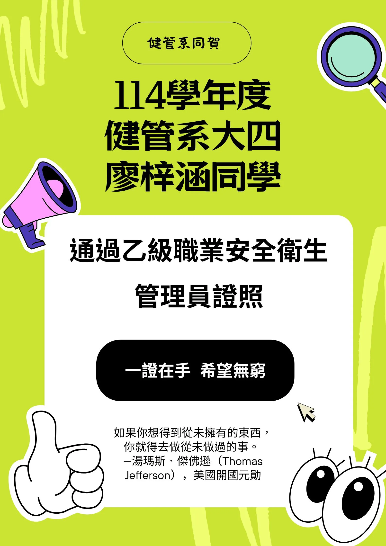 賀~~在校生四年級廖梓涵同學,考取「乙級職業安全衛生管理員」證照。
