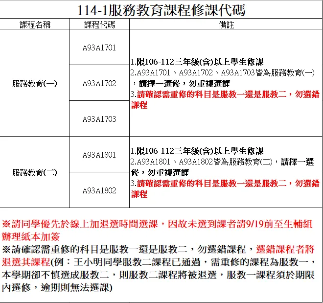 114-1服務教育課程修課代碼服務教育相關資料請參照專區:https://sa1.isu.edu.tw/page/%E5%AD%B8%E7%94%9F%E6%9C%8D%E5%8B%99%E6%95%99%E8%82%B2%E8%AA%B2%E7%A8%8B-HQvz5yqHhByu※