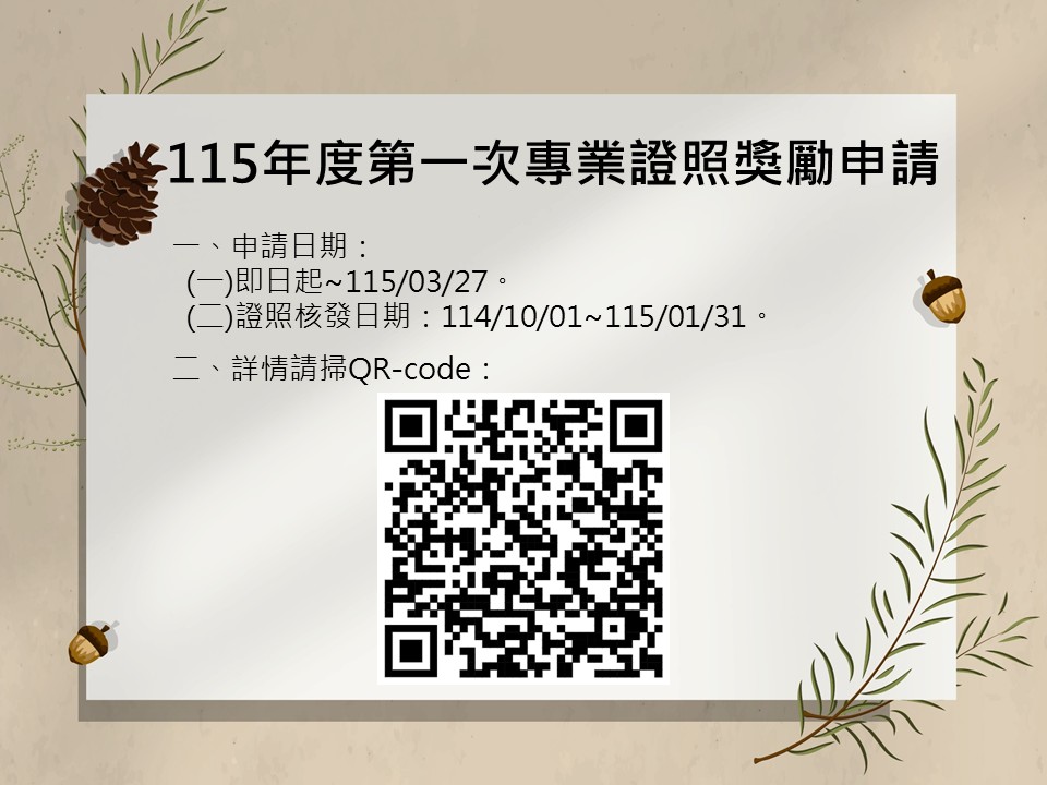 有關115年度第一次學生申請專業證照獎勵及相關事宜說明如下。